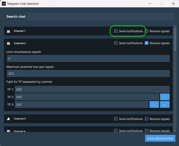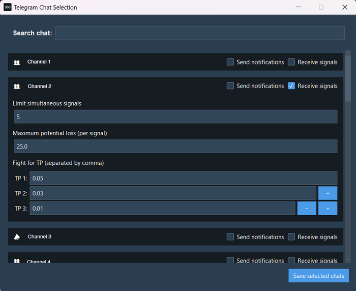- Select the Telegram channels from which you want the software to receive trading signals.