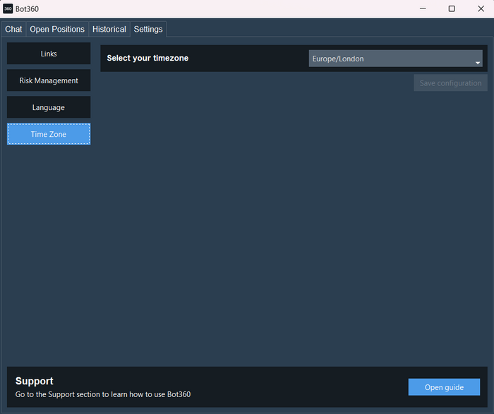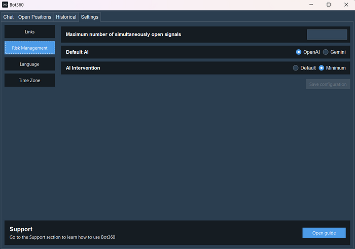 Within the “Manage chat” section (in “Settings”), Bot360 allows you to customize risk management for each Telegram channel. These options enable you to automate capital protection and gradual exit from trades according to your personal risk appetite.